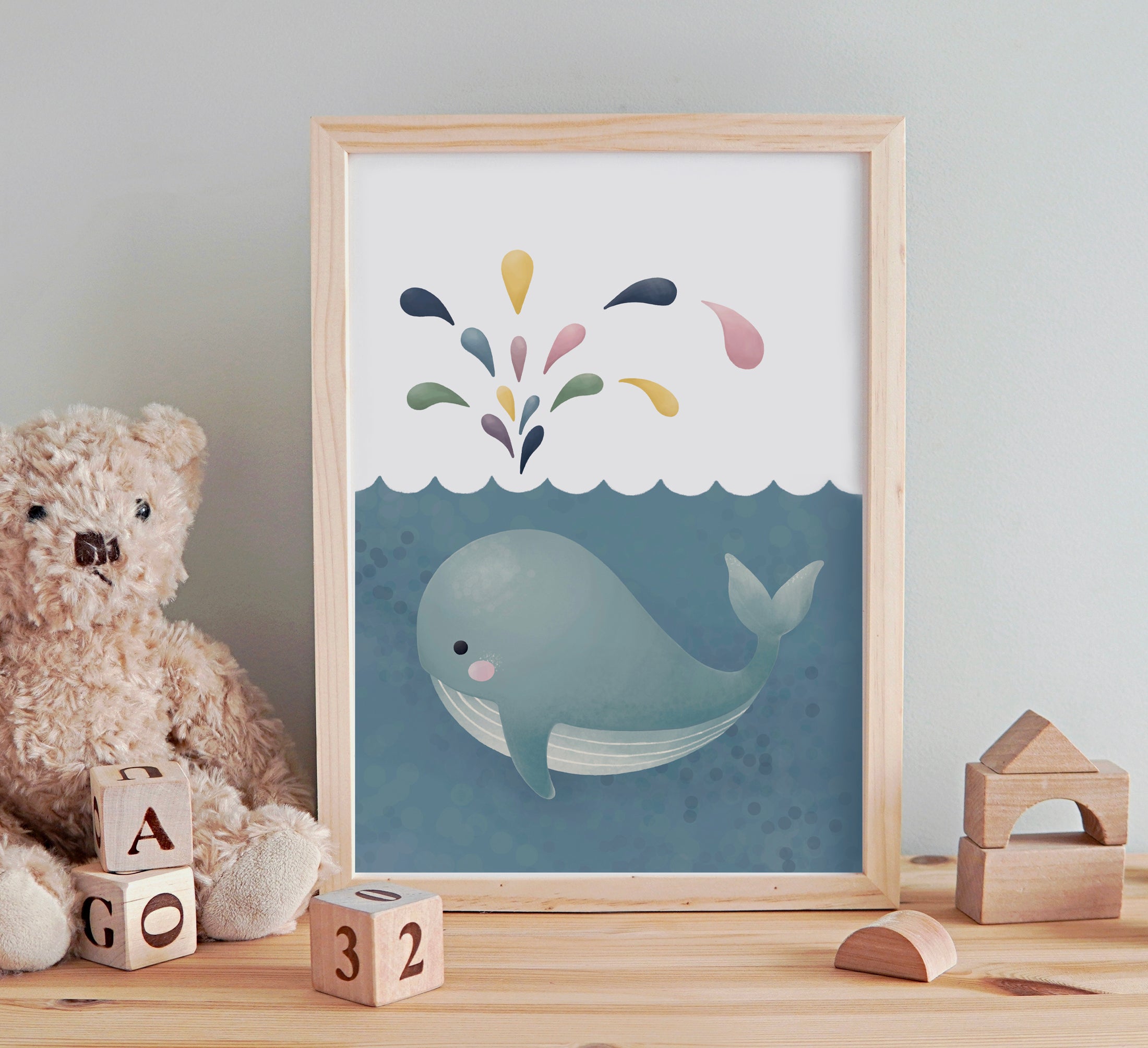 Stampa giclée di alta qualità da un'illustrazione originale ©Tochelì che ha come soggetto la placida balena Susi. Gli spruzzi arcobaleno danno un tocco di colore e la rendono perfetta per essere abbinata ad altri soggetti della collezione stampe per bimbi.